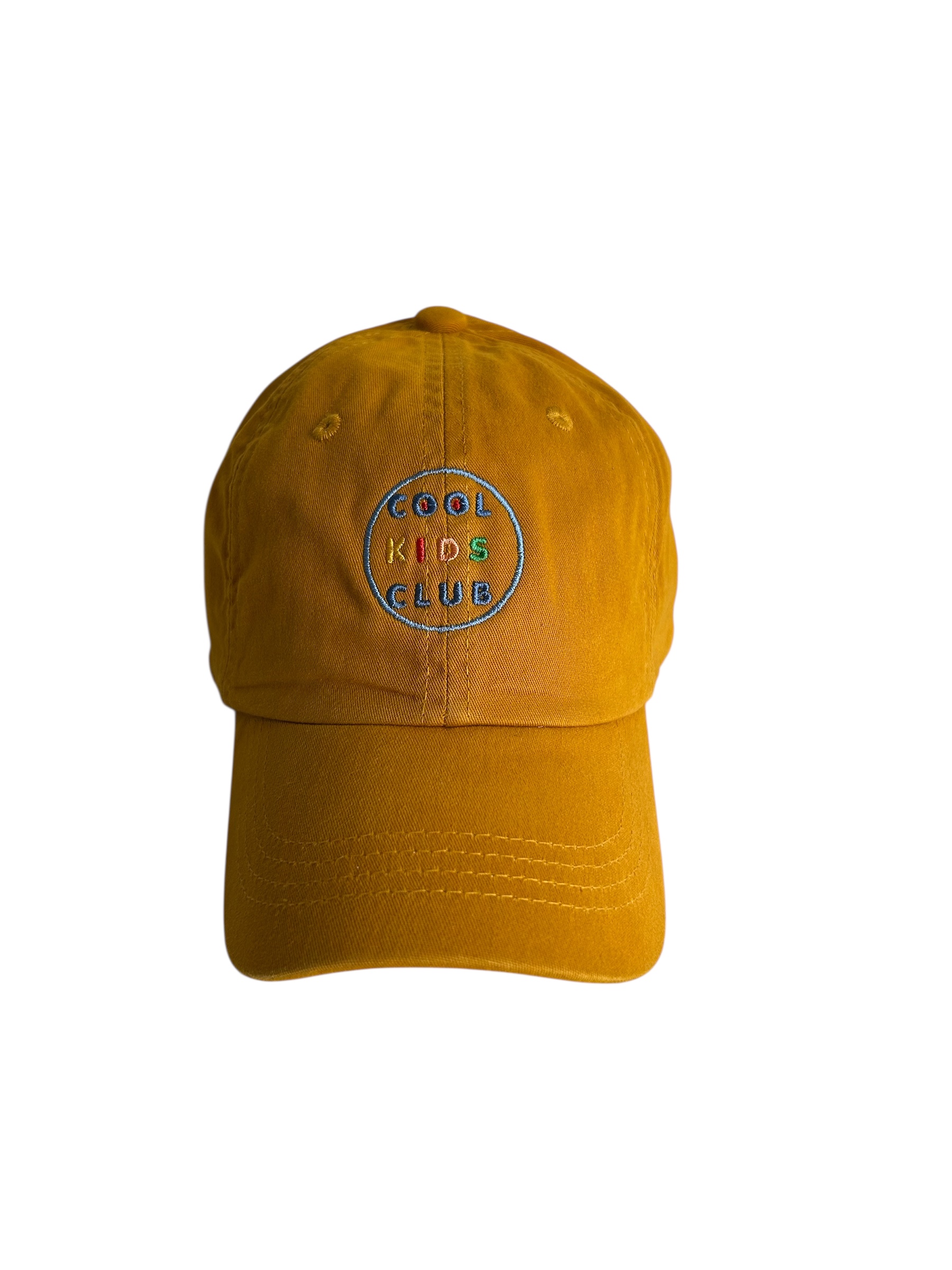 Boné infantil "Cool Kids Club", na cor mostarda, com bordado colorido.