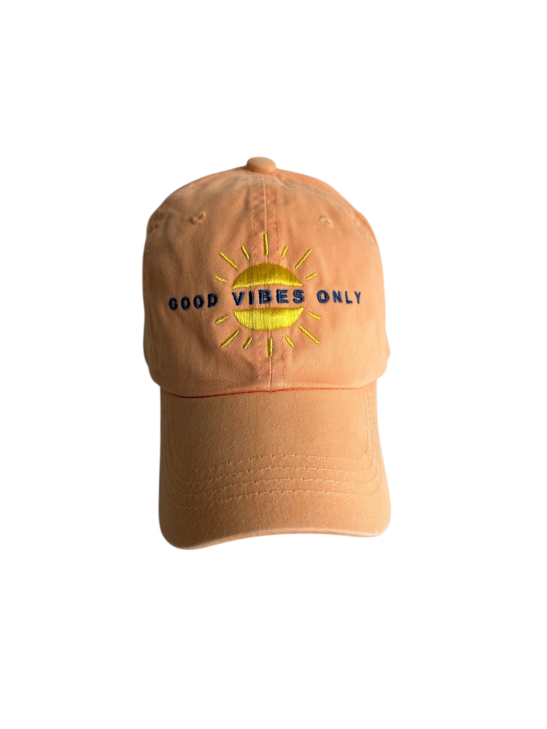 Boné infantil "Good Vibes Only", na cor salmão, com bordado em duas cores.