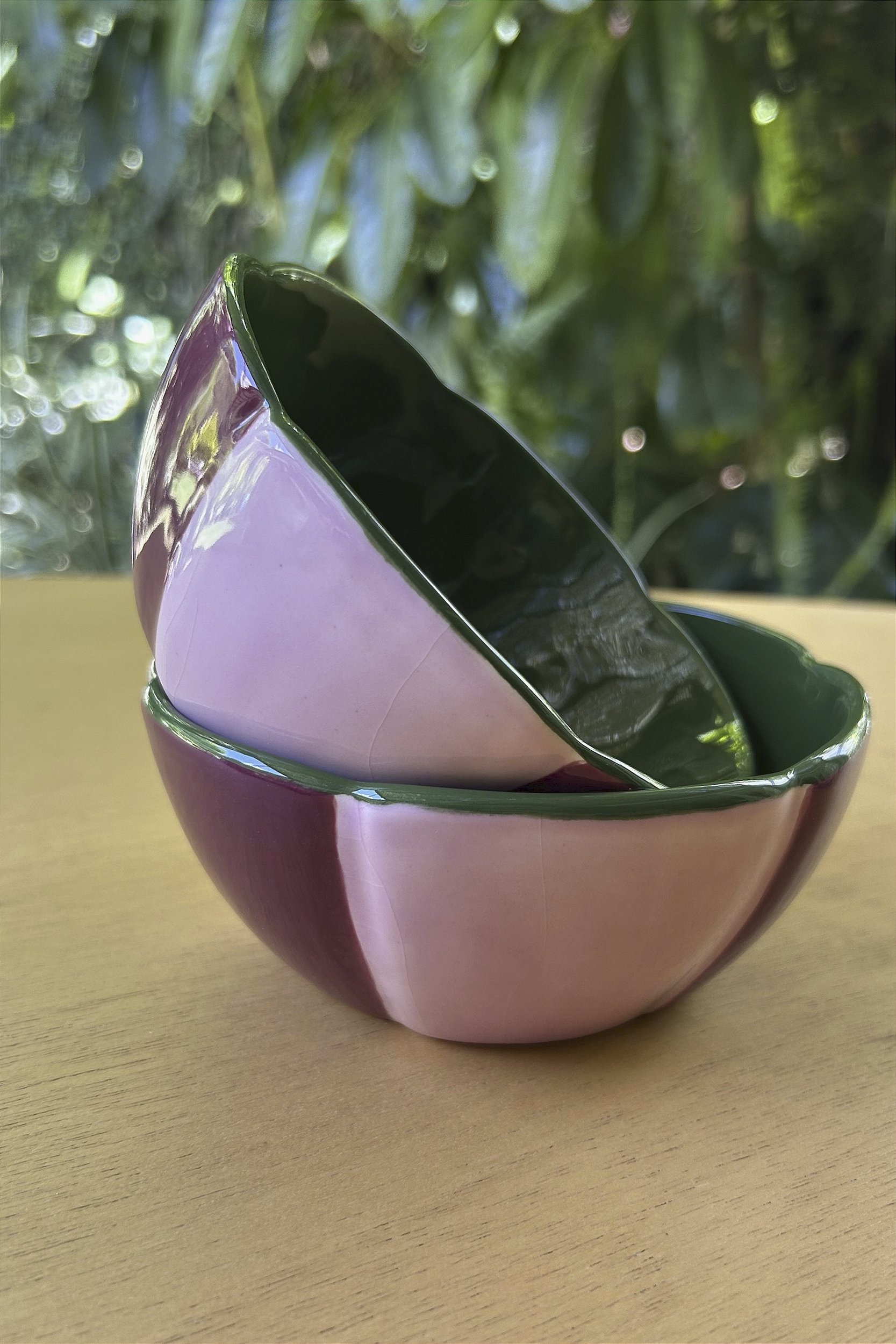 Bowl em cerâmica, com pintura feita à mão. Parte interna do bowl em tom verde e externa com listras intercaladas rosa e vinho.