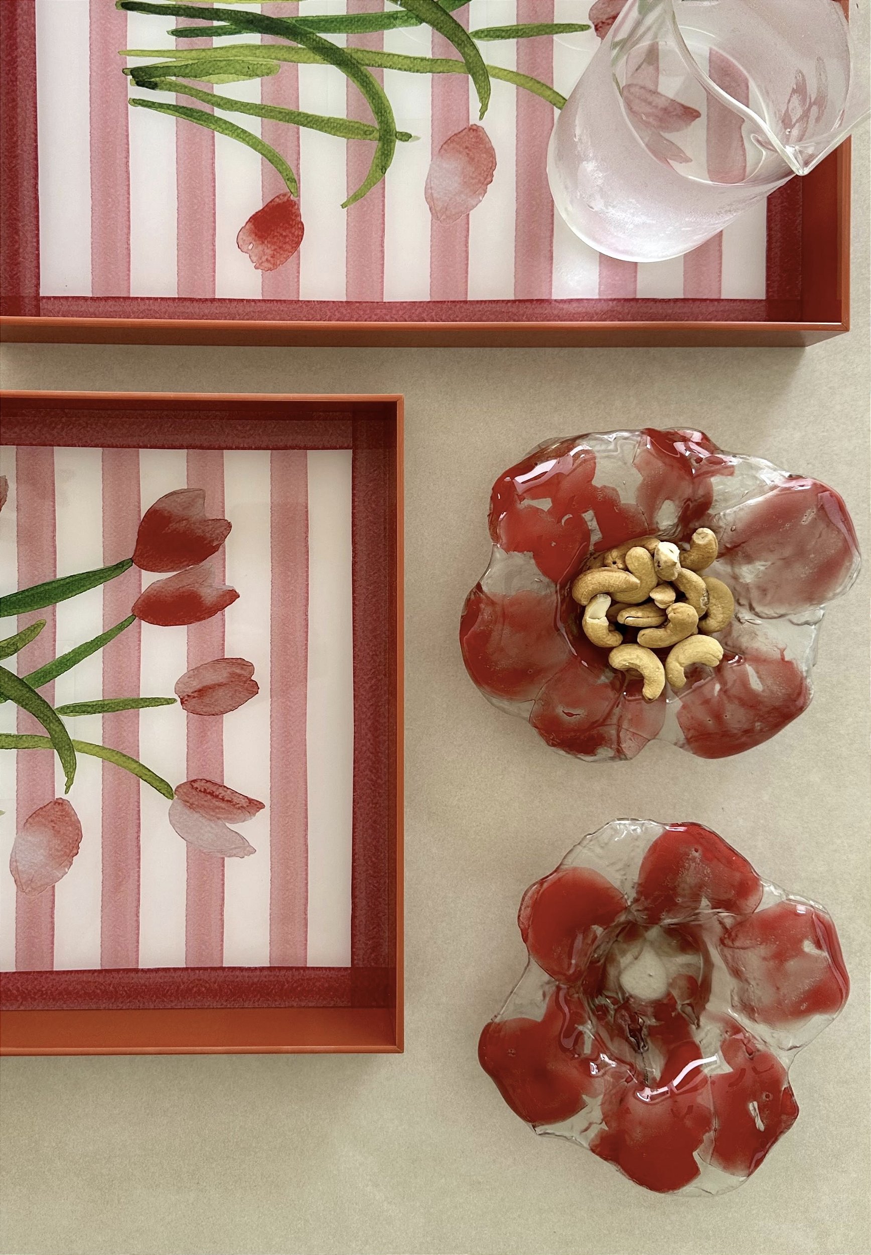 Castiçal de vidro em formato de flor, desenvolvido no trabalho conjunto com o Instituto da artista plástica Debora Muszkat. Cor principal em tom vermelho.
