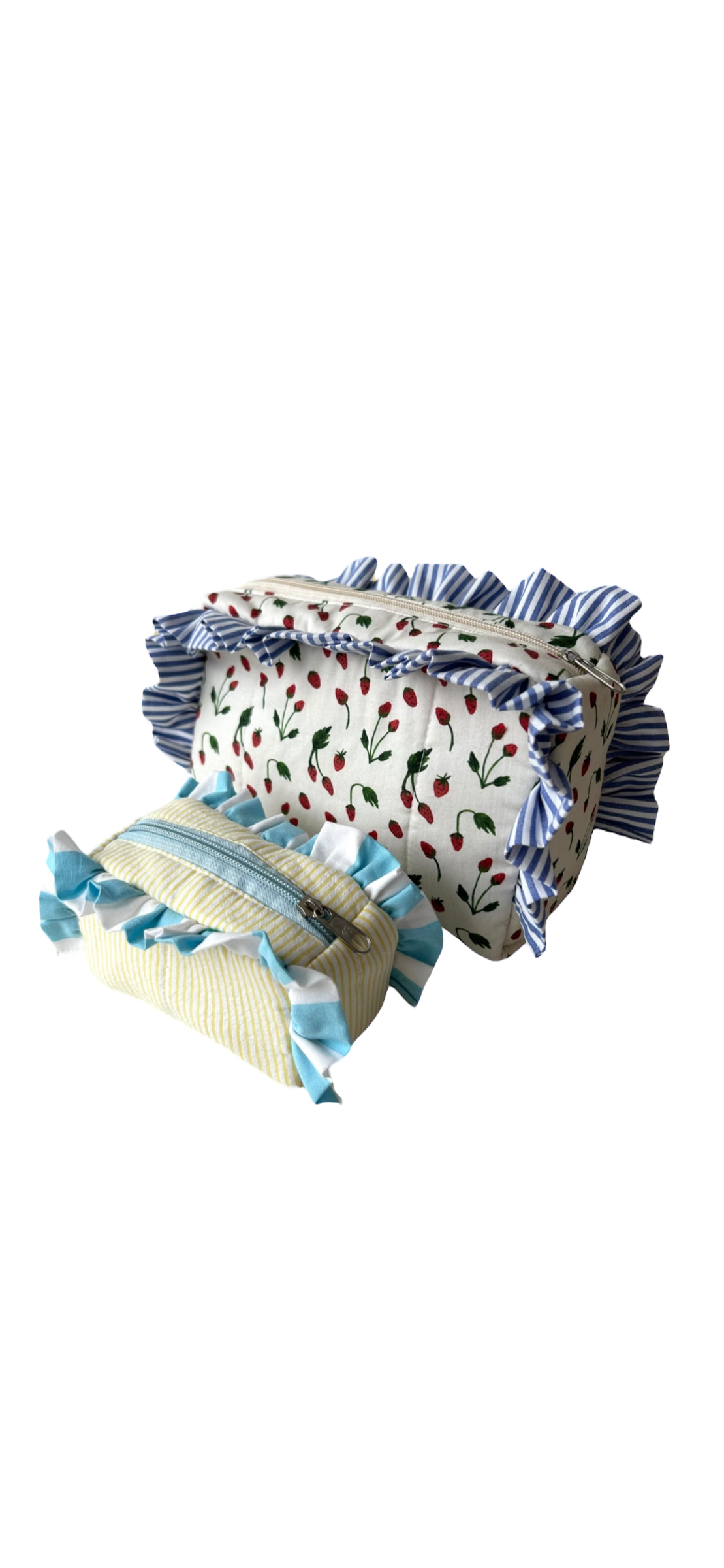 A necessaire M tem o tamanho ideal para levar produtos na mala, enquanto o modelo P é perfeita para ir na bolsa. Ambas forradas, com fechamento em zíper e acabamento de frufru nas laterais.