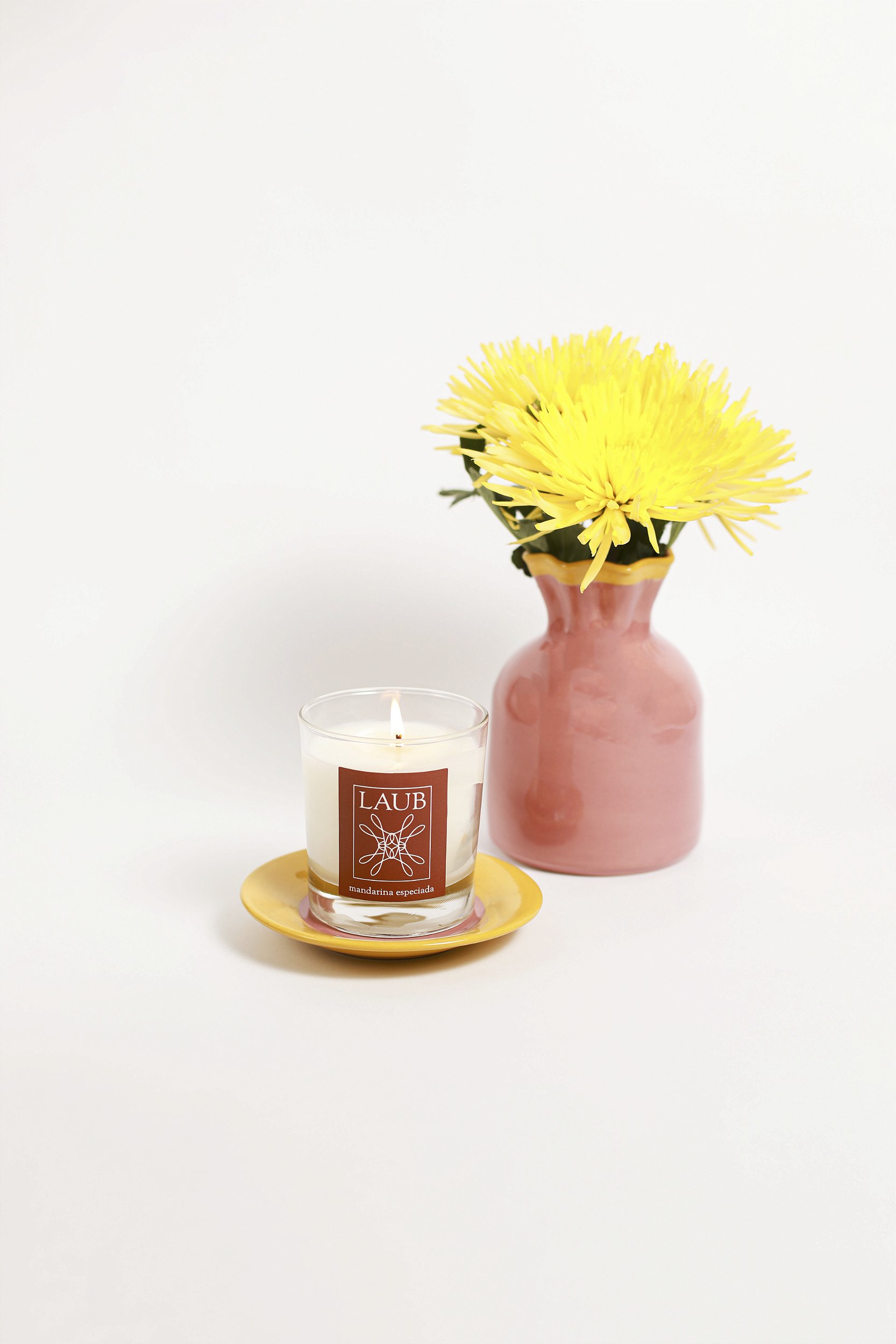 Kit composto por um Vaso de Cerâmica rosa com friso amarelo na abertura, um Pratinho em cerâmica cor rosa com borda amarela e uma Vela com aroma Mandarina Especiada. Combinação perfeita para ser usada junta ou separada, decorando qualquer cantinho da sua casa.