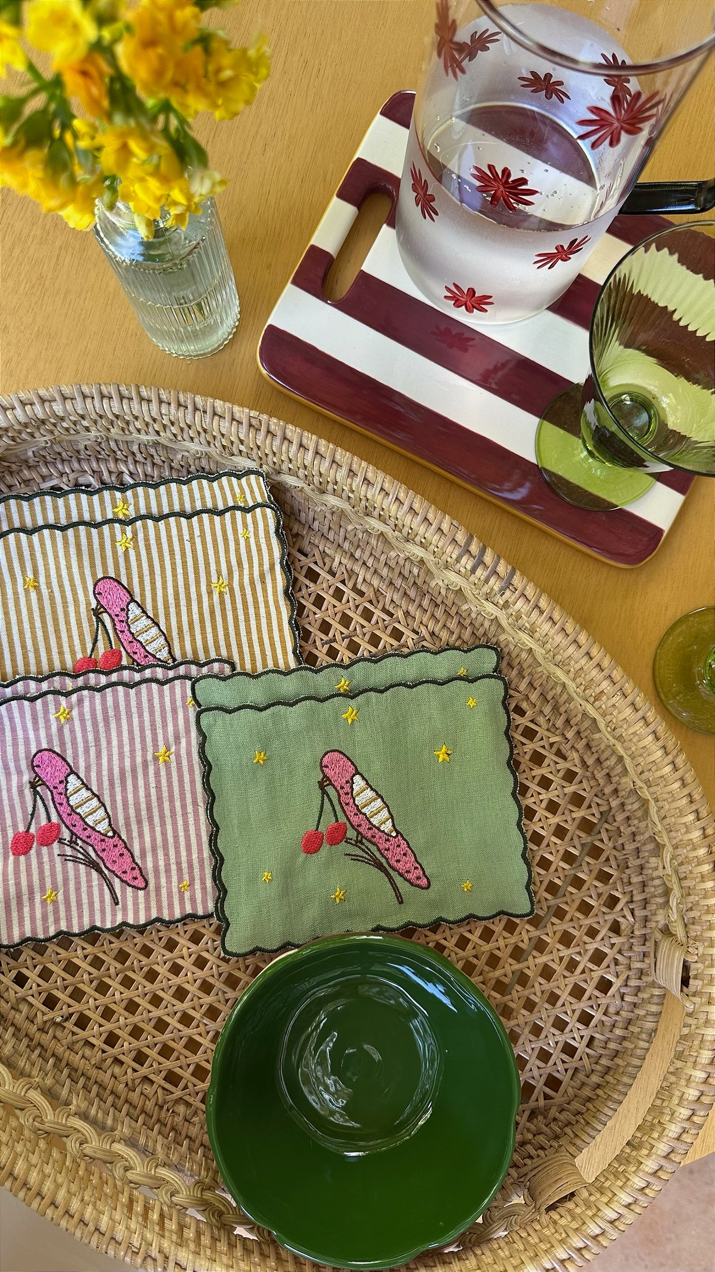 Kit de quatro guardanapos de coquetel em tecido listrado amarelo, com bordado exclusivo da coleção Pássaros.