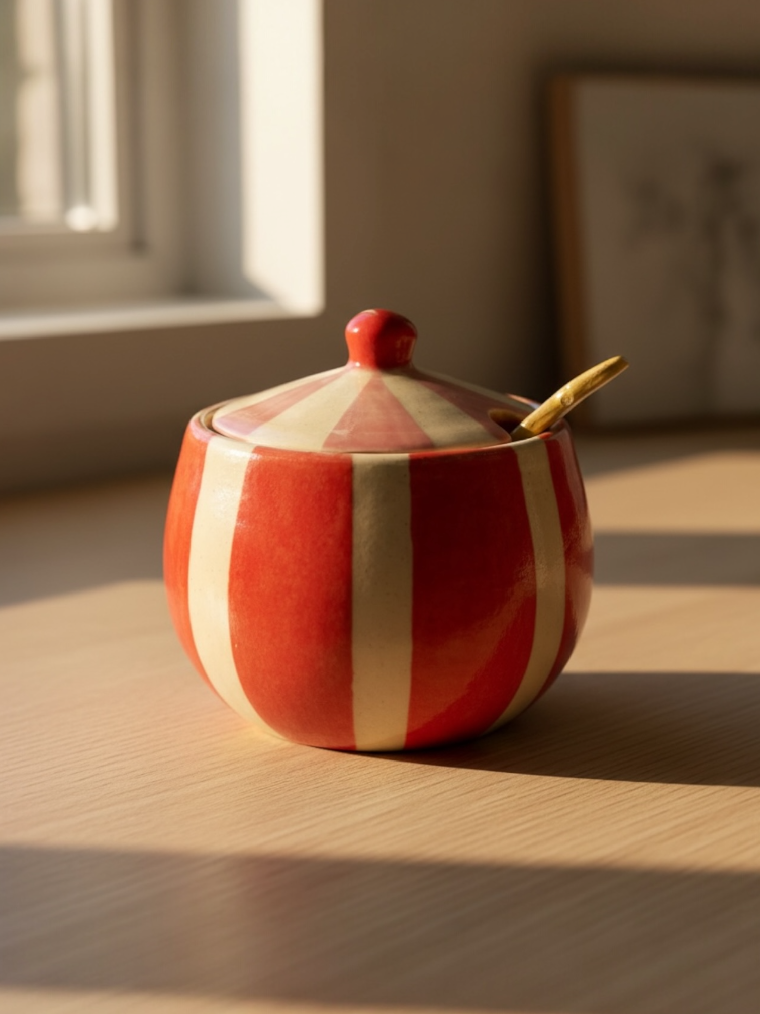 Açucareiro feito e pintado à mão, em cerâmica. Acompanha colher, também em cerâmica.