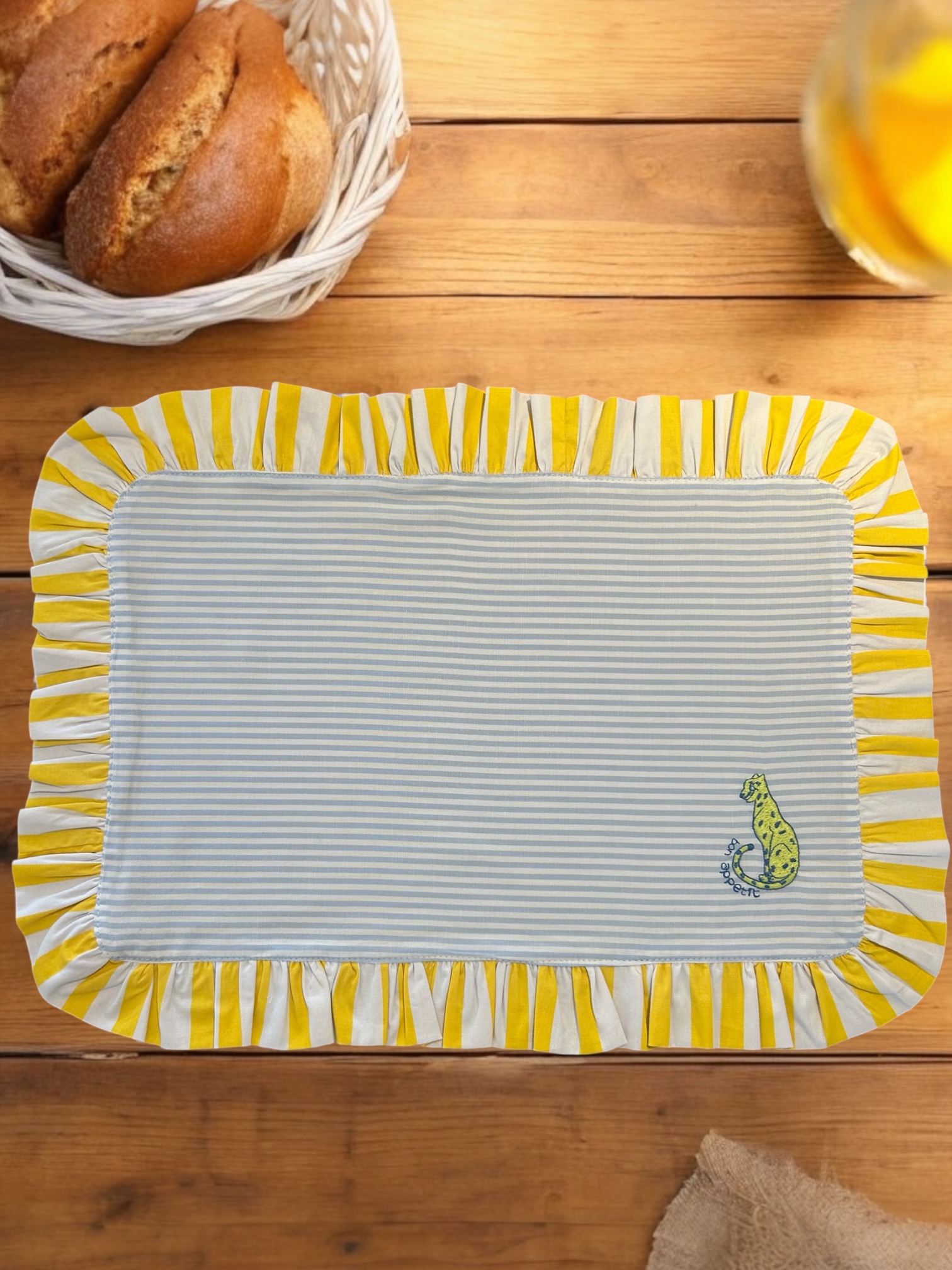 Dupla-face, use-o com o bordado de onça para cima deixando a mesa colorida ou opte pelo lado todo azul para uma combinação mais neutra.