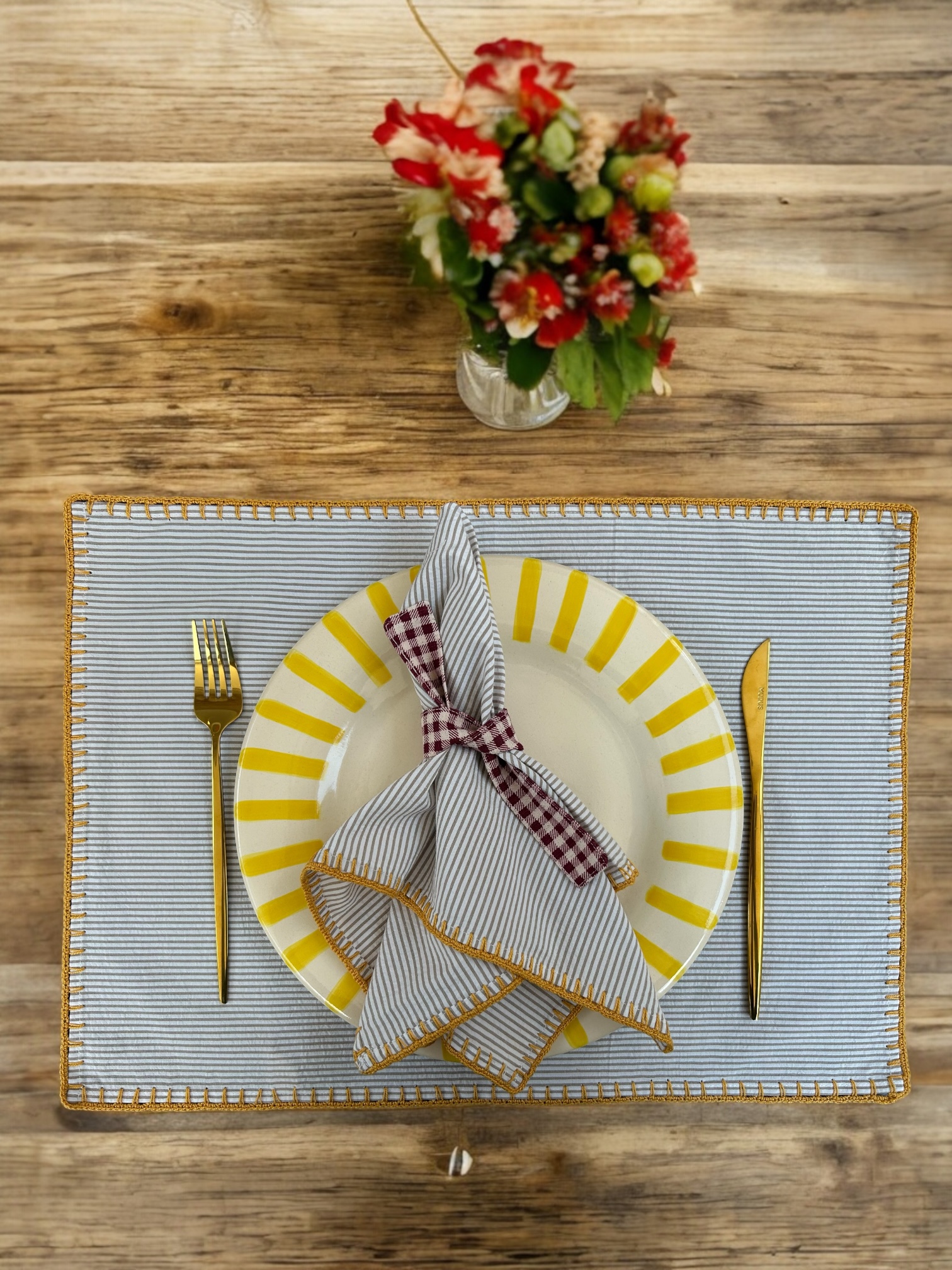Jogo Americano em tecido listrado com toque rugoso e bordas em crochê, feito à mão.