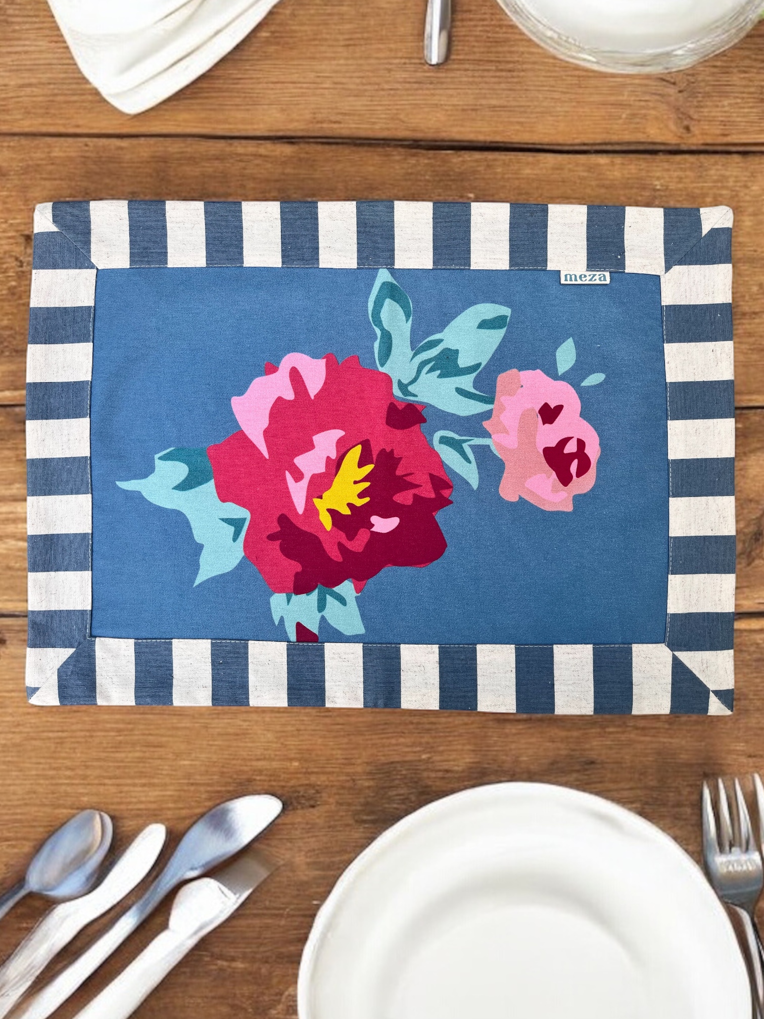 Jogo americano da coleção Tempo, em algodão 100%, desenvolvido em tecido de estampa exclusiva. Bordas com aplicação em tecido listrado.