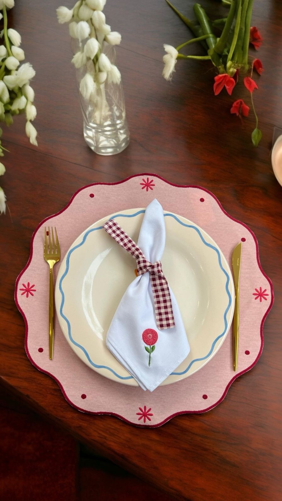 Jogo Americano Impermeável com bordado vermelho escuro.