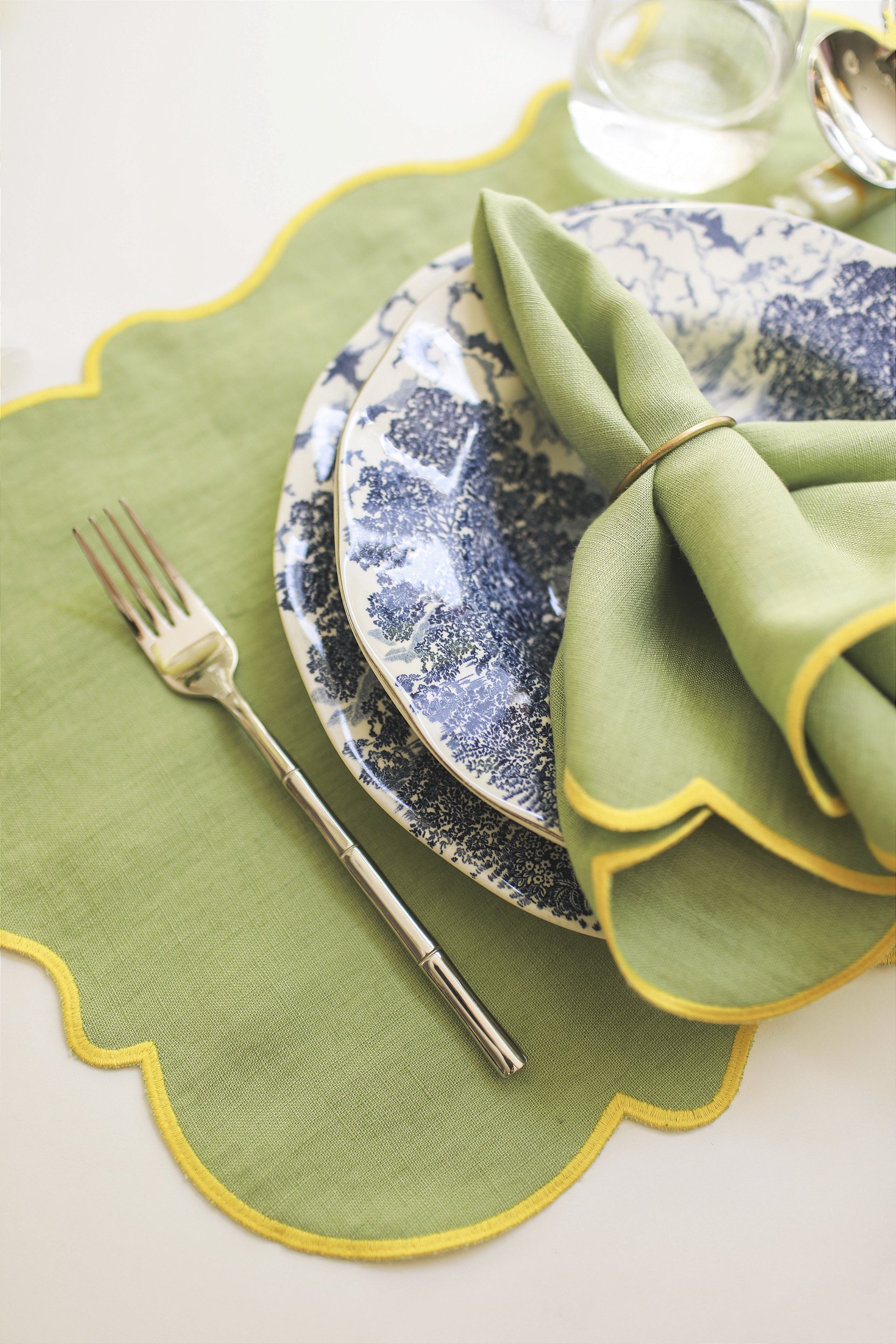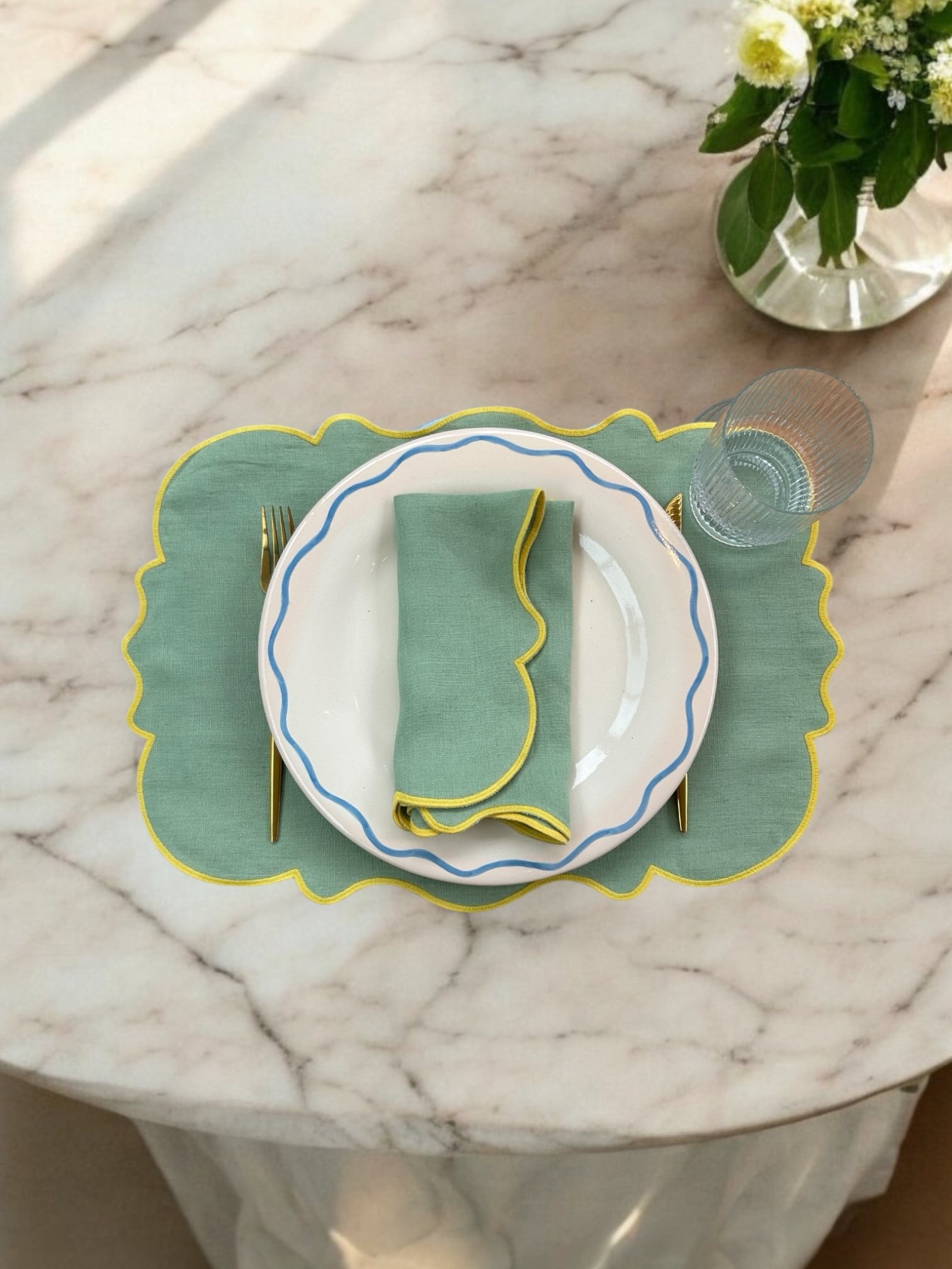 Jogo americano em linho puro na cor verde com borda colorida amarela, trazendo o clássico com um toque de diversão.