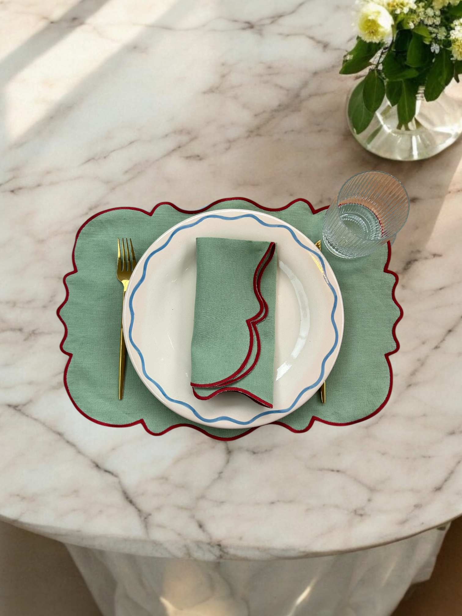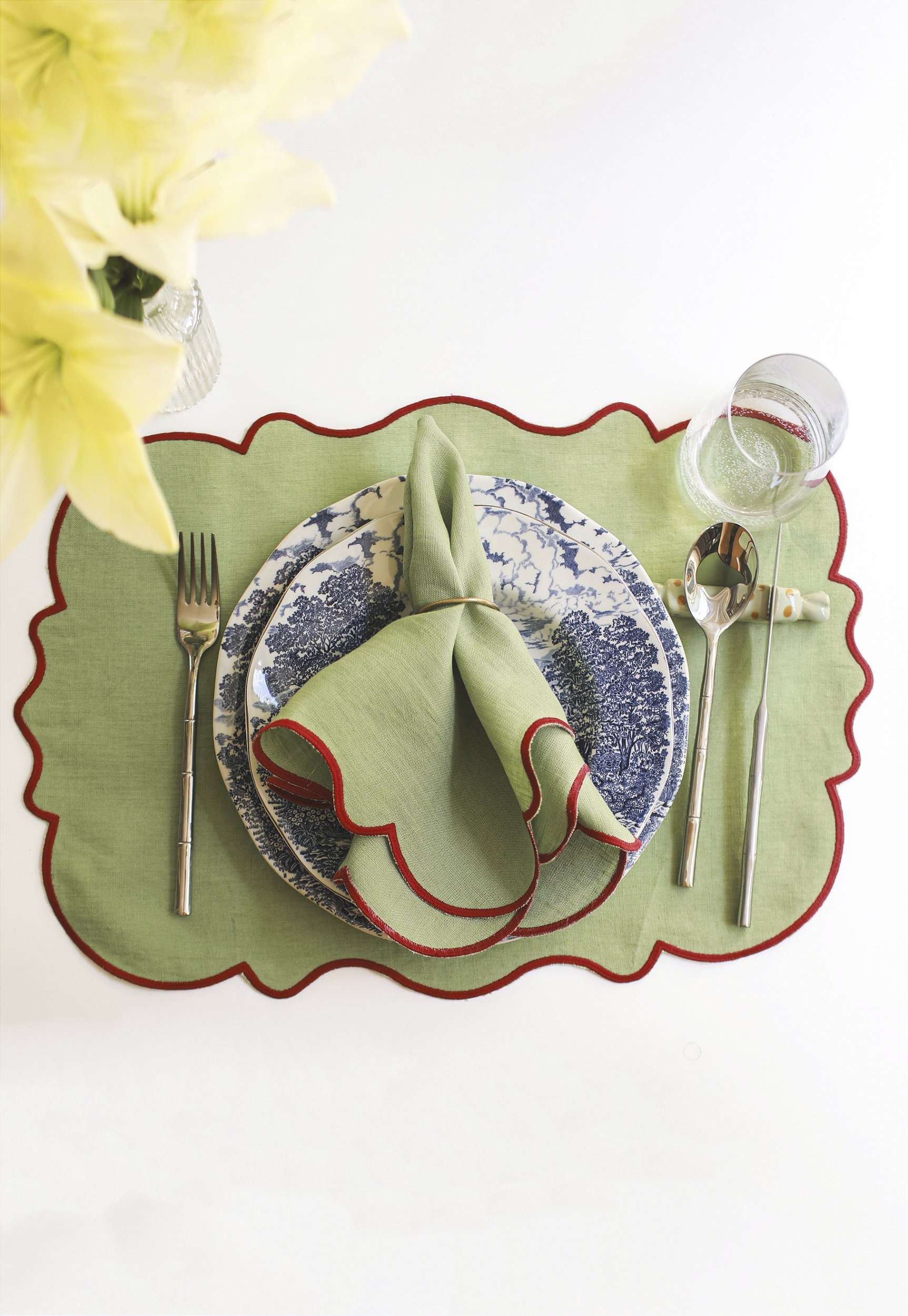 Jogo americano em linho puro na cor verde com borda colorida vinho, trazendo o clássico com um toque de diversão.