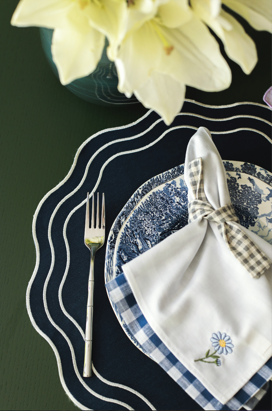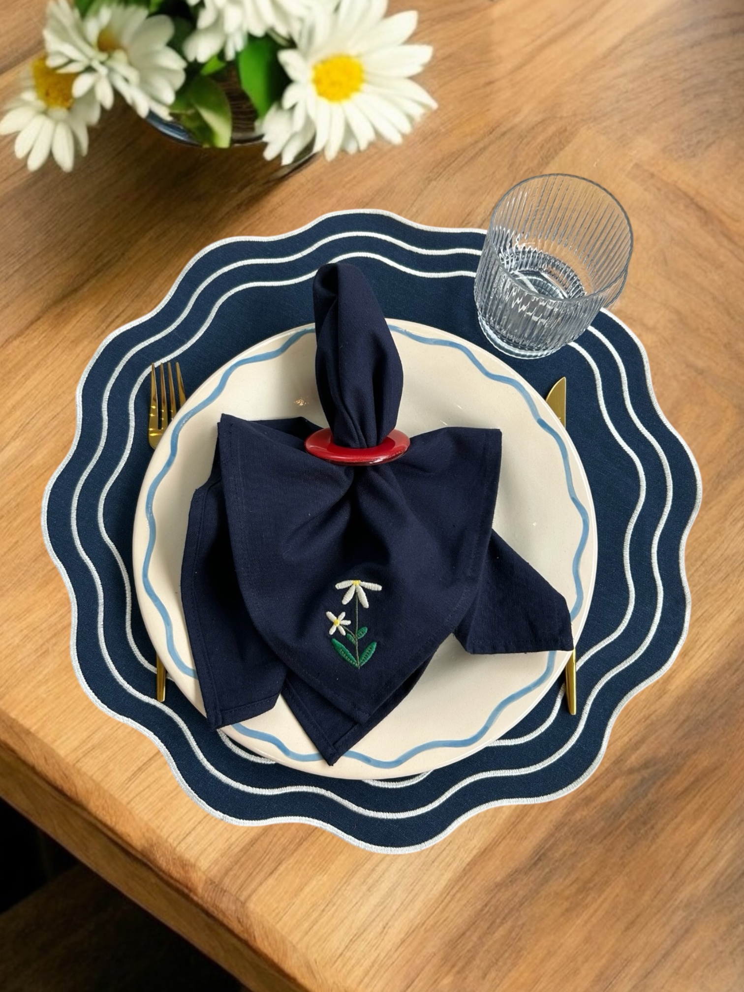 Jogo Americano Impermeável marinho com bordado trionda pérola.
