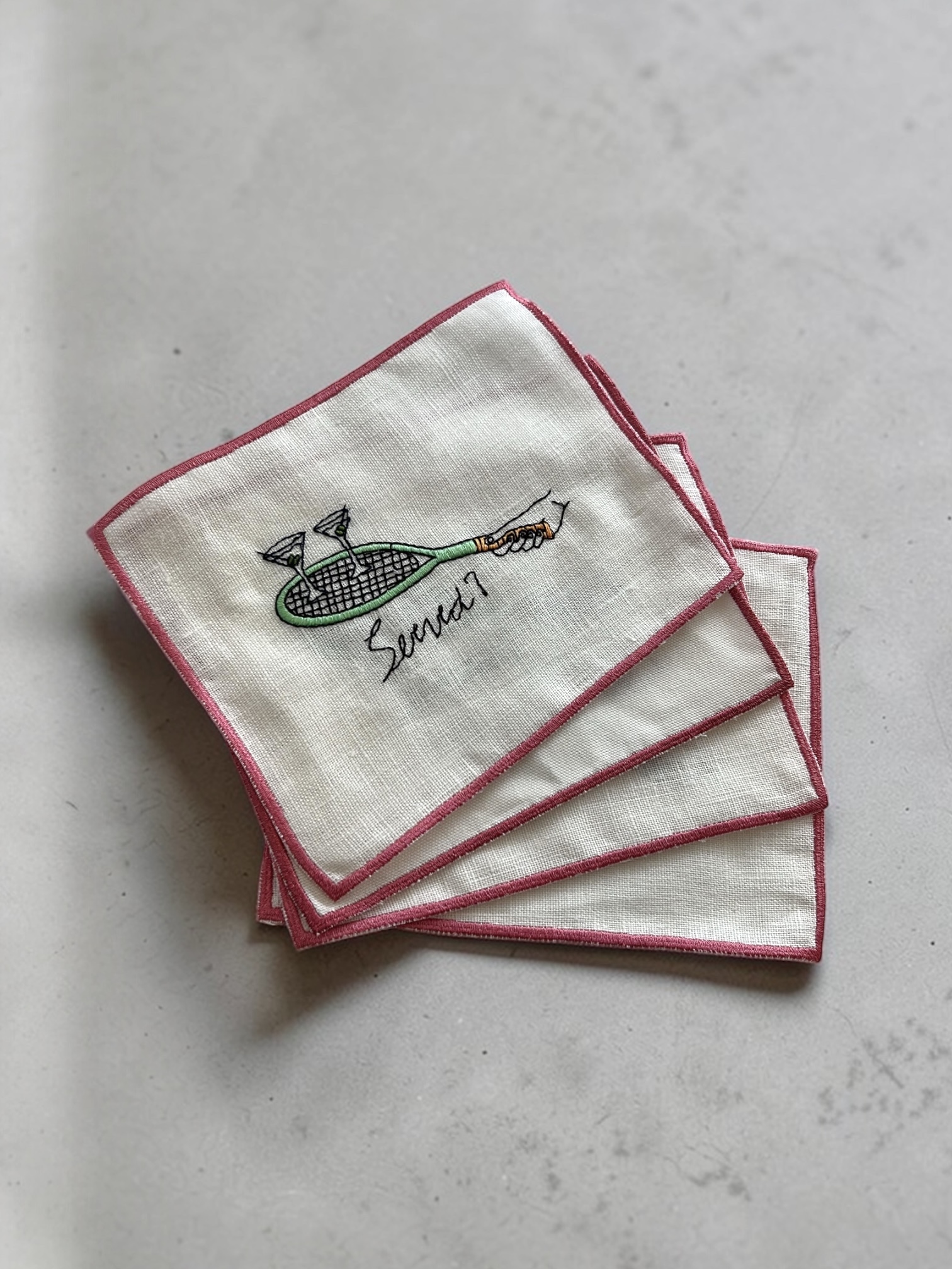 Kit com 4 guardanapos de coquetel ou aperitivo, em tecido linho no tom off-white e bordado de raquete de tênis com a pergunta "Served?". Bordas coloridas em quatro cores.