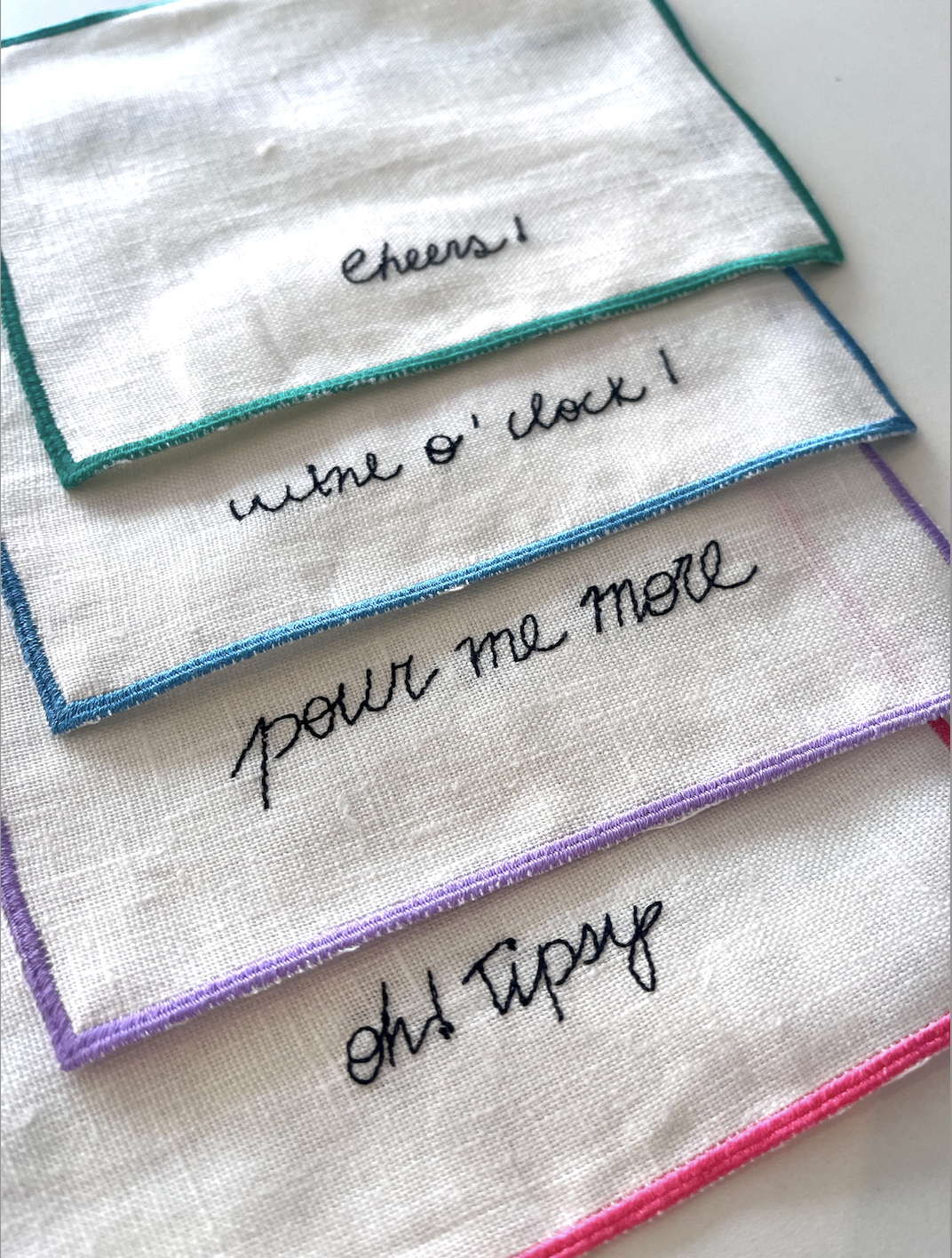 Kit com 4 guardanapos de coquetel ou aperitivo, em tecido linho com quatro frases divertidas bordadas no tema "Happy Hour". Acabamento das bordas coloridas, nas cores rosa, lilás, verde e azul.
