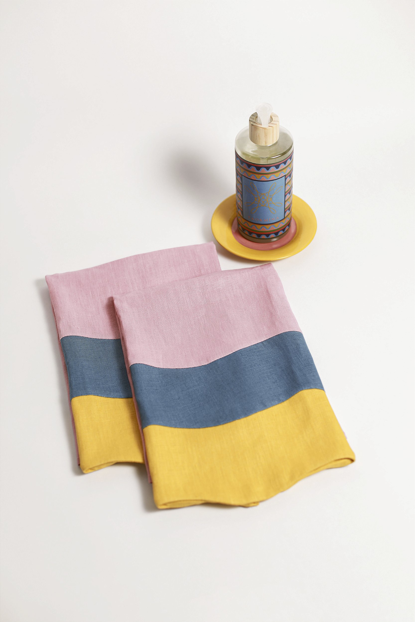 KIt composto por um Sabonete Líquido Taormina (aroma cítrico), um Pratinho Rosa em Cerâmica e duas Toalhas de Lavabo em tecido 100% linho.