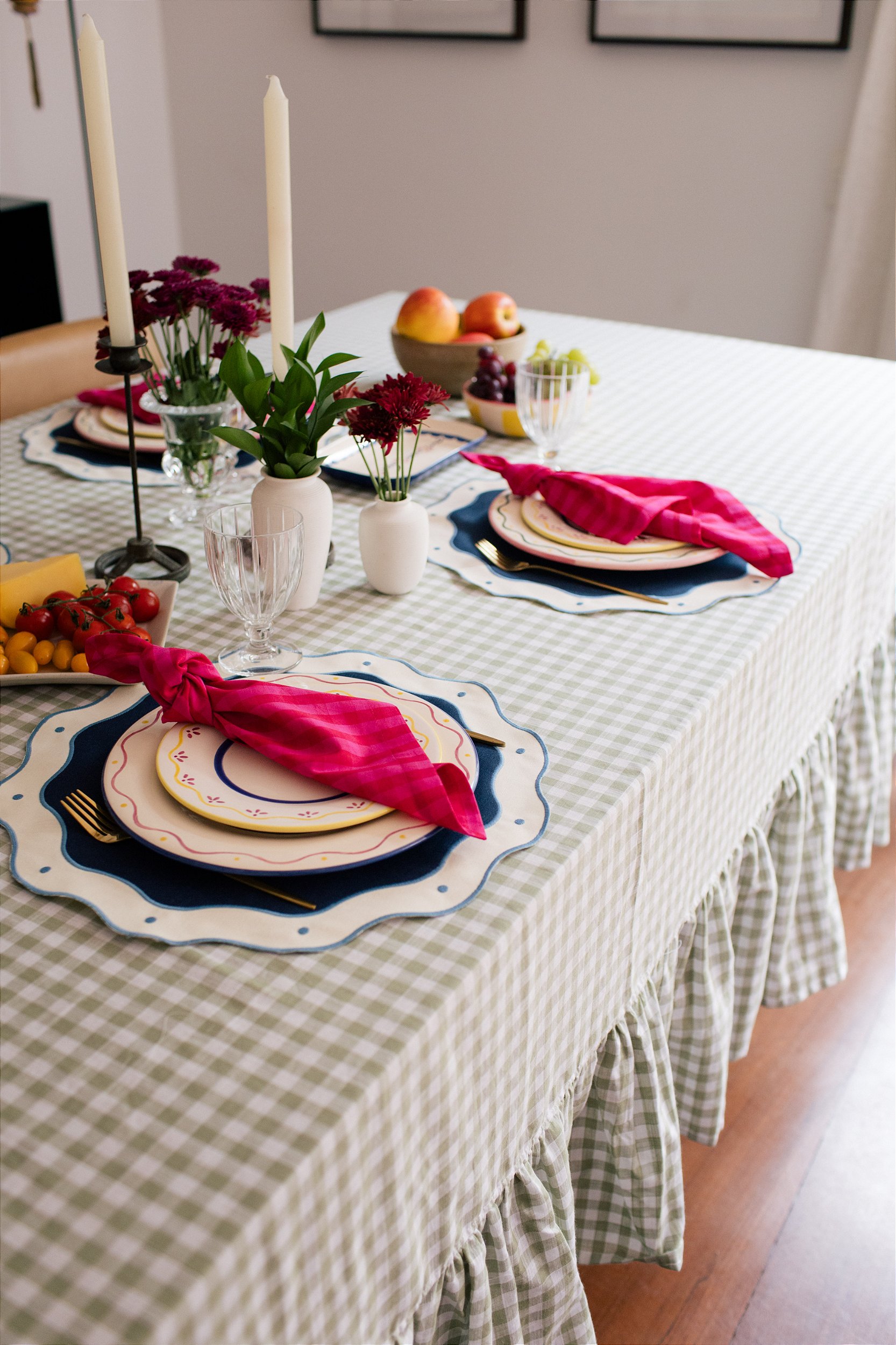 Toalha de mesa em algodão 100%, estampa xadrez e detalhe da barra em babado (os babados possuem 25cm). Mesa para 10 pessoas