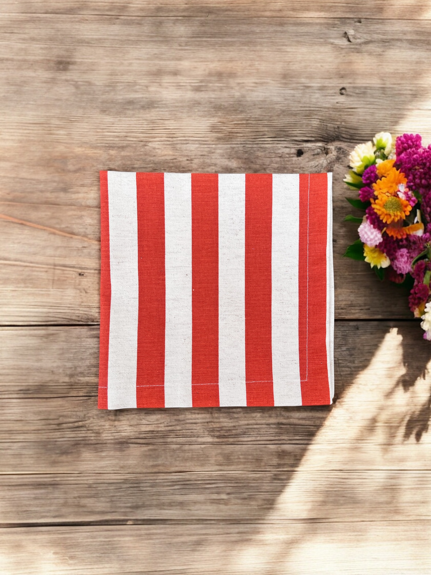 Guardanapo de mesa em tecido 100% algodão. Tecido listrado crú e vermelho.