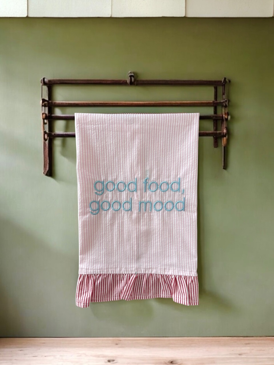 Toalha listrada com detalhe de babados e bordado divertido "Good Food Good Mood". Para colorir sua cozinha!