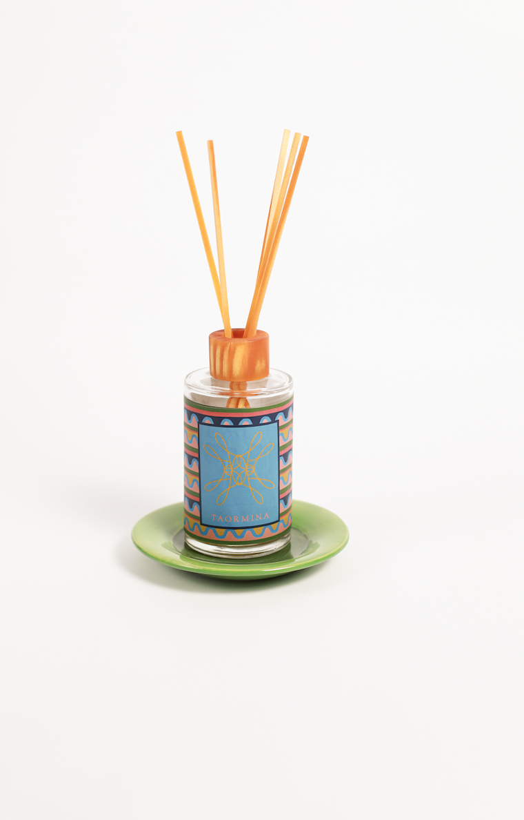 Kit composto por um difusor de ambiente com fragrância cítrica, inspirado no Taormina, e um pratinho em cerâmica com pintura à mão. Use em qualquer ambiente, para perfumar a sua casa.