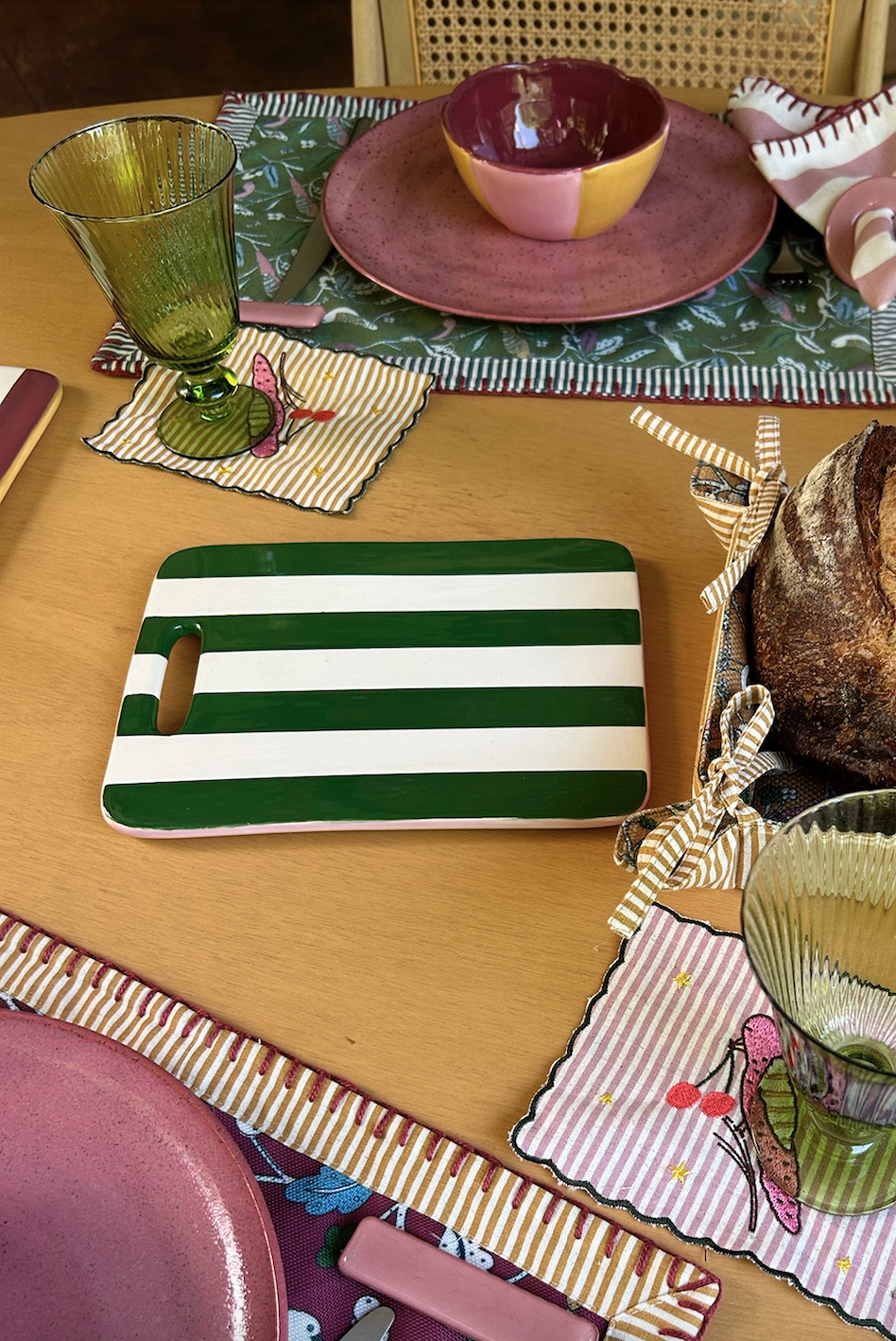 Tábua em cerâmica, com pintura feita à mão. Listras em tom verde.