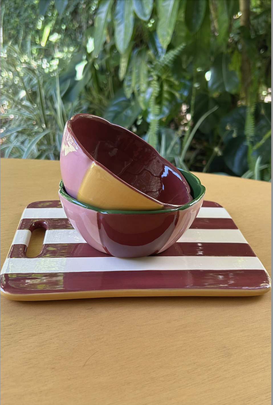 Tábua em cerâmica, com pintura feita à mão. Listras em tom vinho.