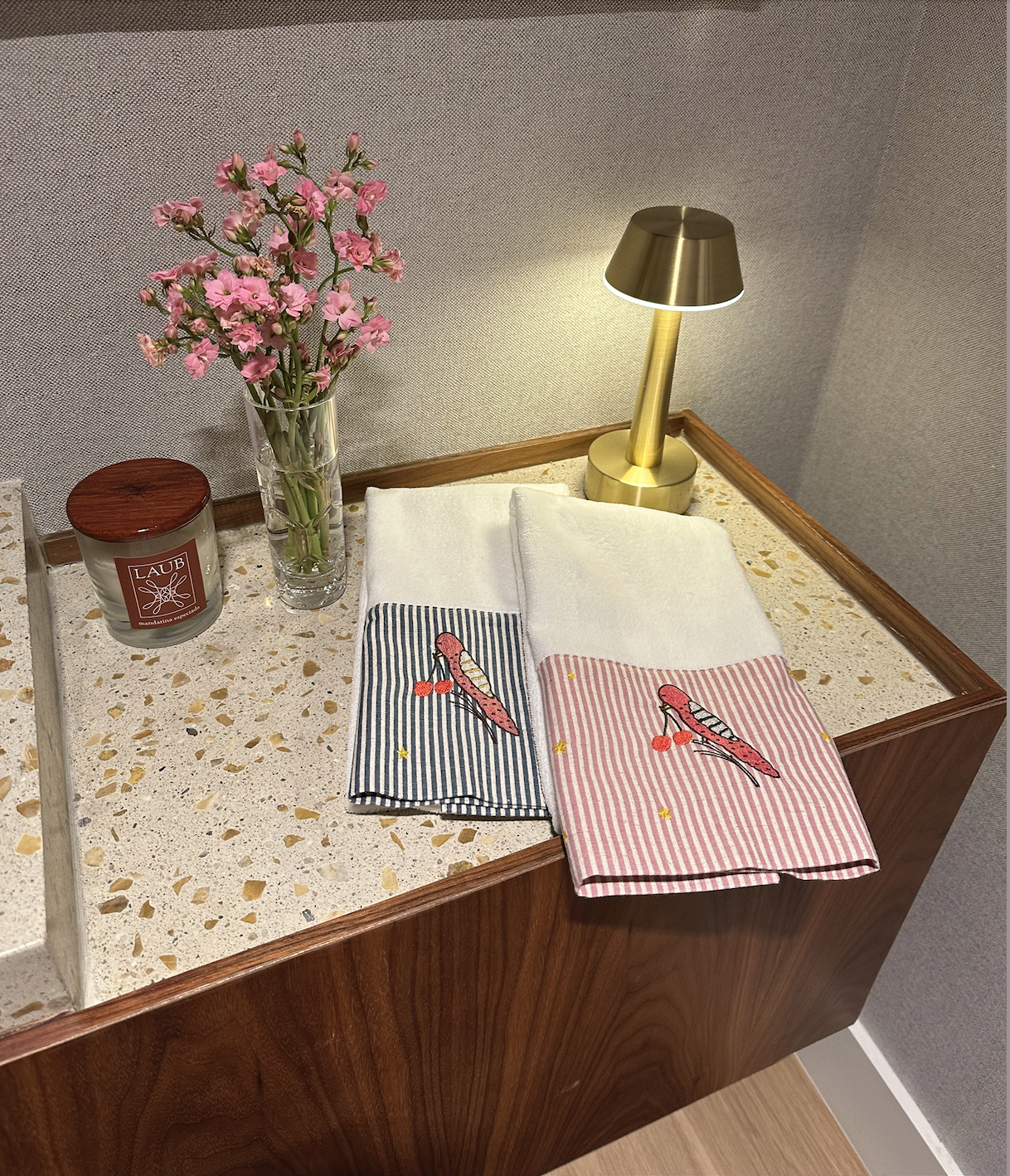 Toalha de lavabo em tecido felpudo e barrado aplicado, com bordado exclusivo da coleção pássaros.